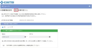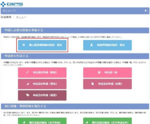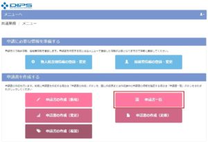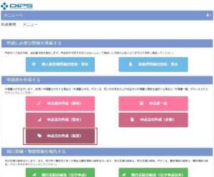 ②メニュー画面中央あたりの「申請書の作成(更新)」ボタンを押す