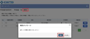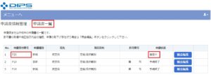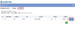 今まで申請した申請書一覧が表示されるので、一番上の行を確認してみる。申請受付番号が表示され、「審査中」となっている。