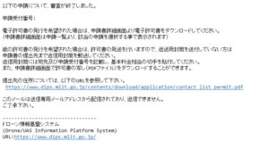 受け取る許可証形式で紙を選択した場合、申請受付番号を記載した返信用封筒に切手を貼り、管轄の提出先に送るのを忘れないこと。提出先については無人航空機の飛行ルール許可・承認手続きについてを参照のこと。