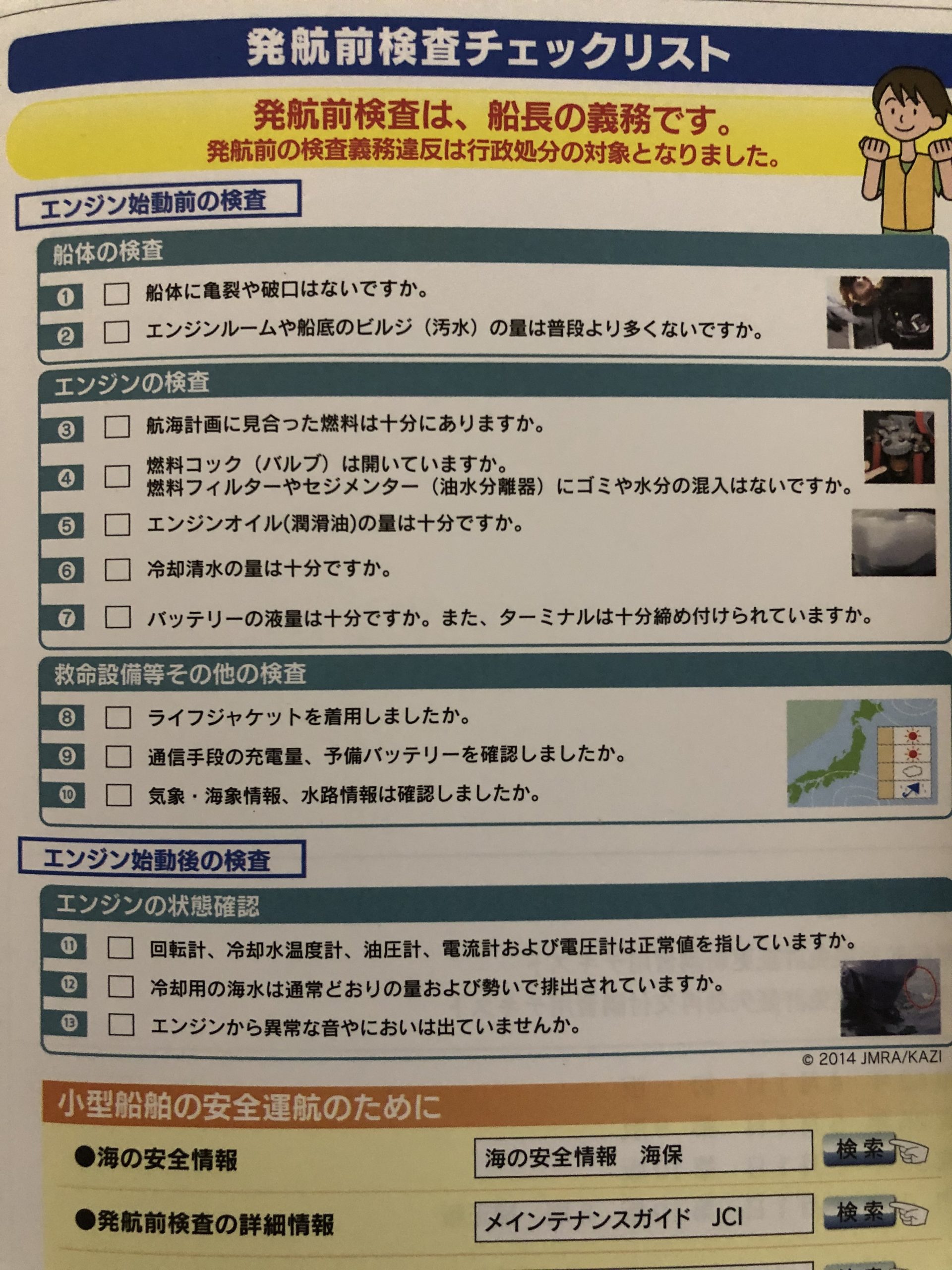 プレジャーボート海難事故の約4割は、機関等の点検不足に起因するエンジン停止・航行不能となる事故だそうで、発航前検査を確実に実施し、その記録を所持しておかなければならない。